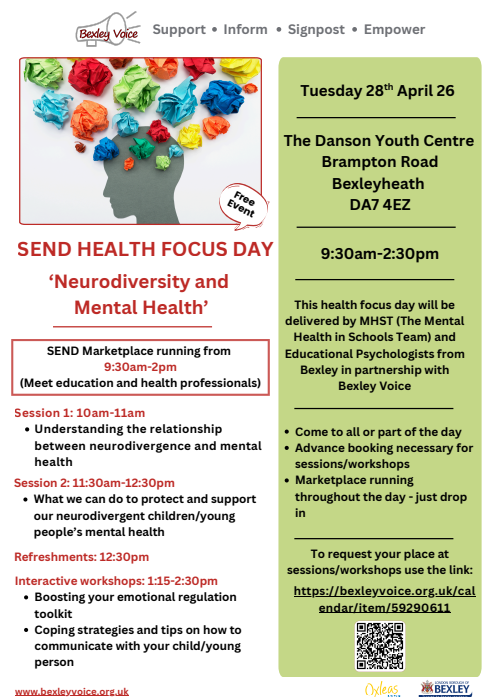 Danson Youth Centre Danson Youth Centre, Brampton Rd, BexleyheathThis health focus day will be delivered by MHST (The Mental Health in Schools Team) and Educational Psychologists from Bexley in partnership with Bexley Voice. We will have a stand and representative present there, so if you have any questions you'd like to ask us on neurodiversity and mental health, or our services, join the