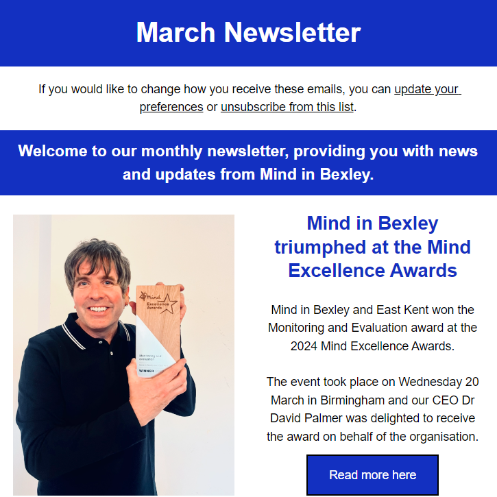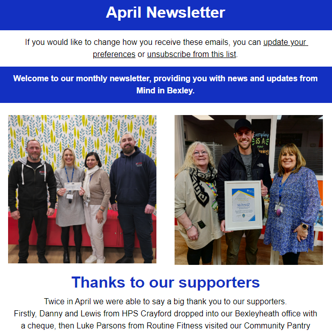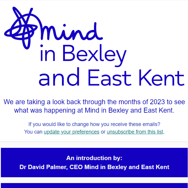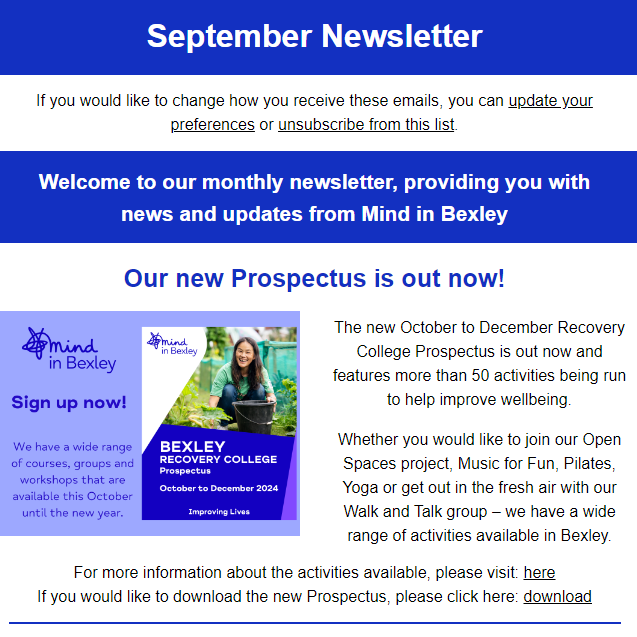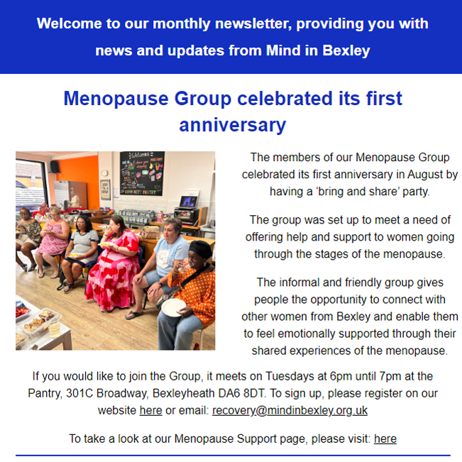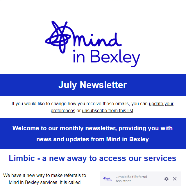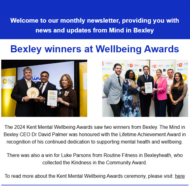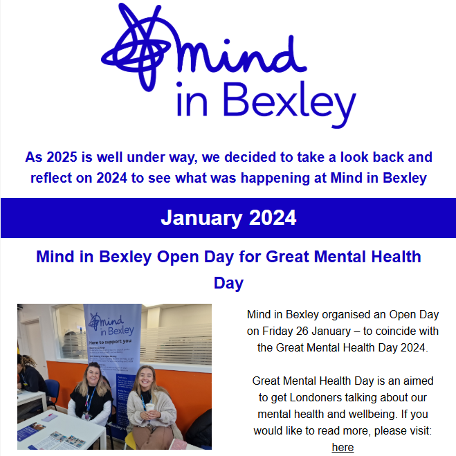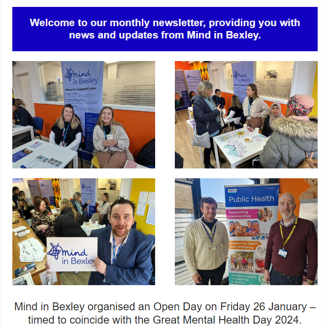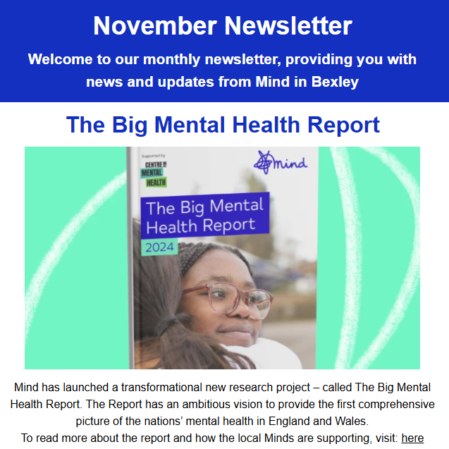 At Mind in Bexley, we produce monthly newsletters that are aimed to keep you connected and informed. Each monthly edition is packed with the latest updates about our charity’s work, including upcoming events, new courses, groups and workshops, as well as valuable information on mental health resources available to residents in Bexley.